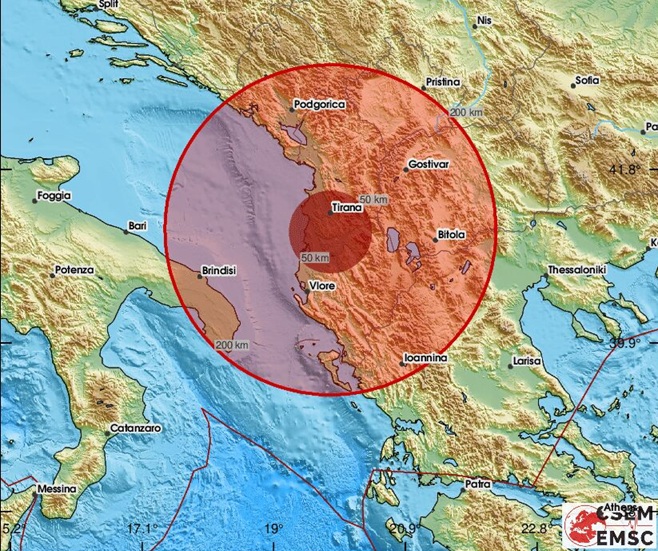 According to the first reports by the EMSC the 15km depth earthquake had the epicentre 16 km east-north of Lushnjë and 22 km south-west of Elbasan.