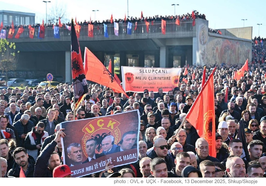 Prishtina/Skopje, 13 December 2025, dtt-net.com - Thousands of Kosovo Albanians joined by those in North Macedonia held a rally today in capital Skopje in support of former leaders of Kosovo Liberation Army (KLA), who are in trial at the EU-sponsored court in The Hague on charges of war crimes during the 1998-1999 war for independence from Serbia.