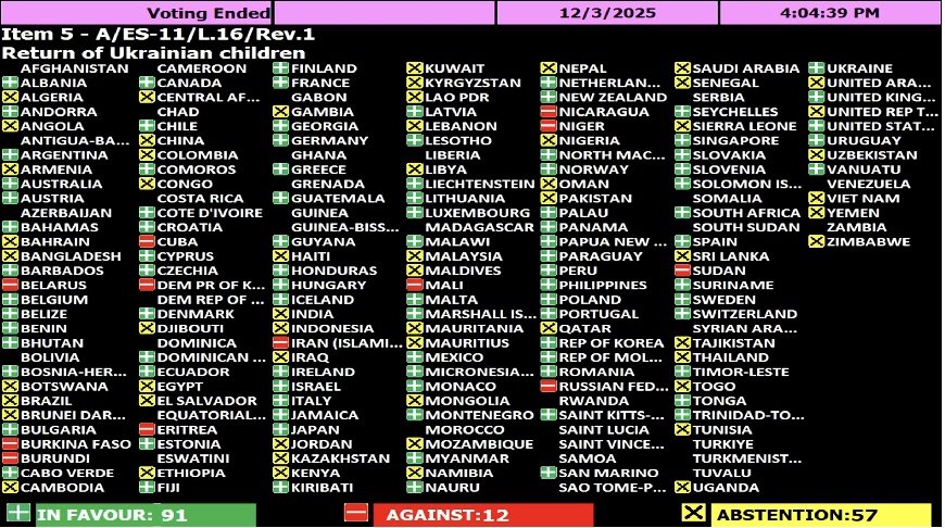 Belgrade/New York, 05 December 2025, dtt-net.com – Serbia was amidst 29 members of the United Nations General Assembly which two days ago refused to vote on a resolution adopted which calls Russia unconditional return of Ukrainian children to their families.