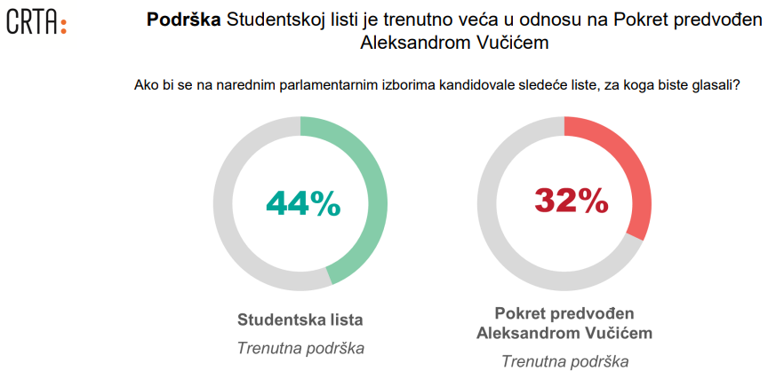 44 percent would vote for Students List and 32 percent for Aleksandar Vucic-led coalition, in next parliamentary elections, according to the survey of CRTA NGO organization.