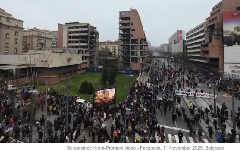 Belgrade, 11 November 2025, dtt-net.com – Thousands of Serbia students and citizens took the streets today in capital Belgrade protesting against plans of government to demolish the former army headquarter and construction of luxury hotel by Donald Trump’s son-in-law at the location.